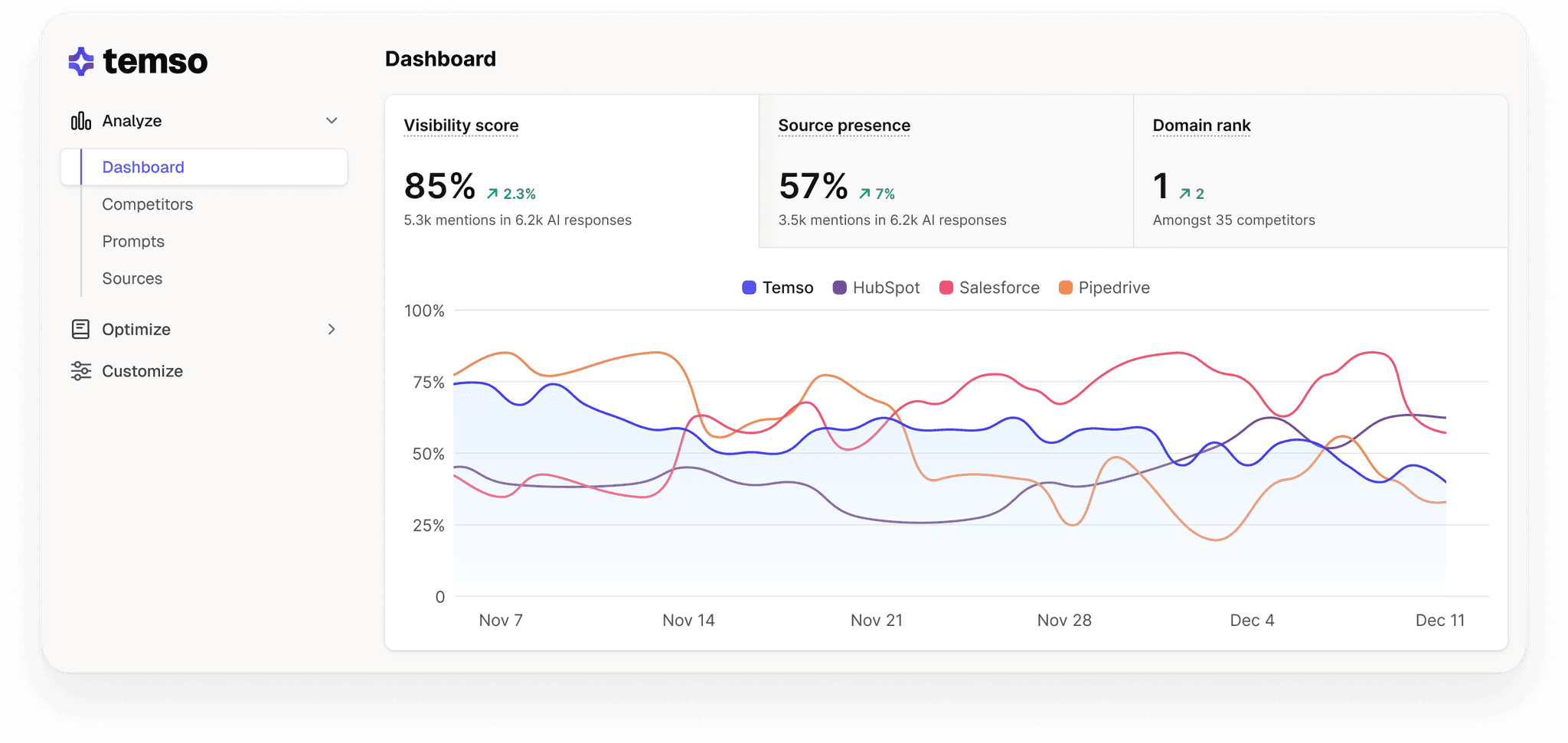 Yes. Temso’s benchmarking shows exactly how you stack up against competitors in GEO and AEO, so you can identify gaps and outgrow them.